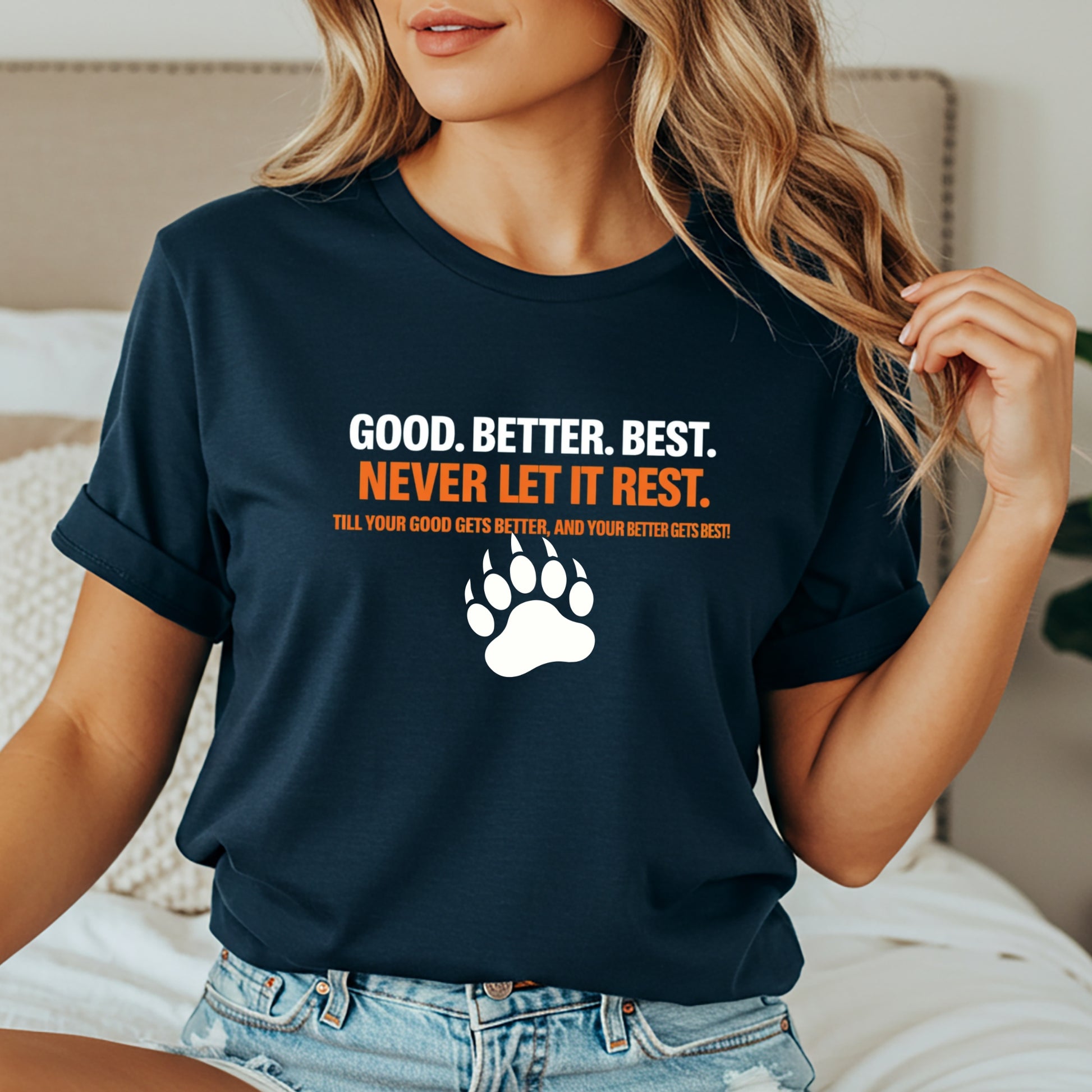 Chicago Bears Game Day fan t-shirt quote: Good. Better. Best. Never Let It Rest. Front Print T-Shirt