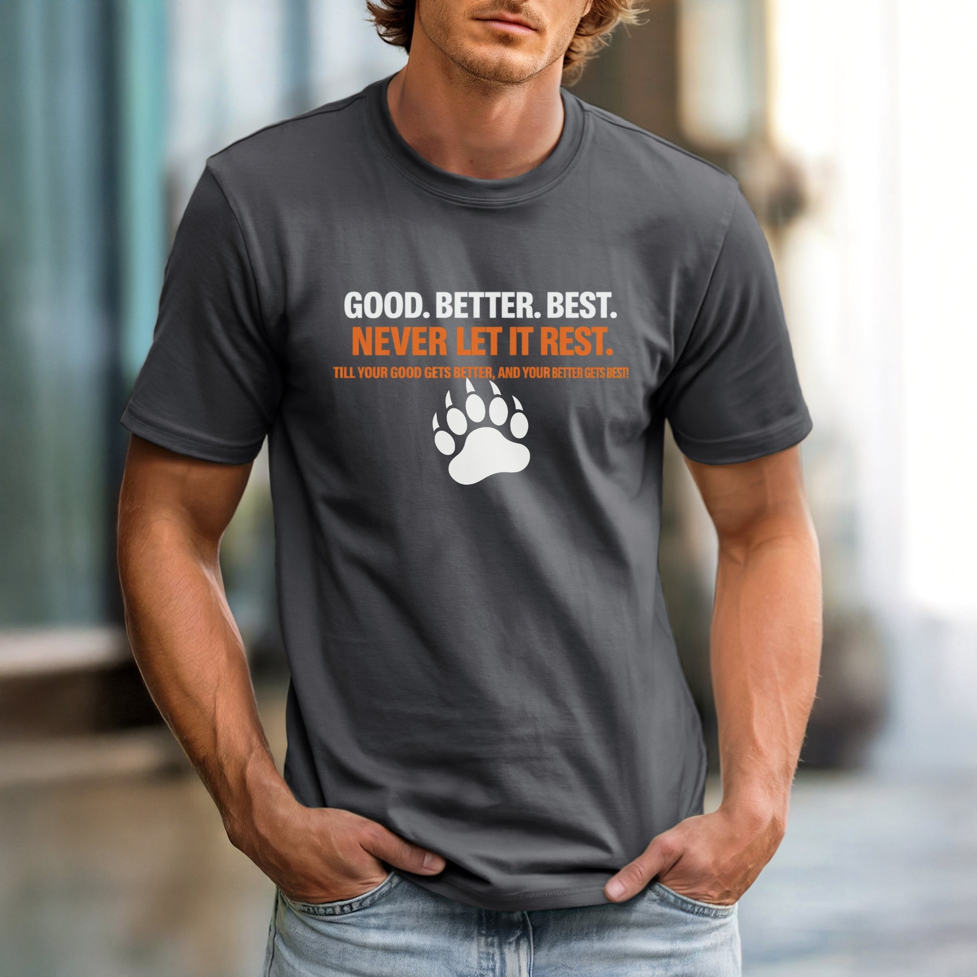 This heavyweight garment-dyed tee carries quiet strength — soft, worn-in color and a lived-in texture that invites touch. The front print reads: “GOOD. BETTER. BEST. NEVER LET IT REST.” above a bold paw print, a simple statement for people who push limits and protect what matters. The relaxed fit and substantial 6.1 oz cotton give it presence without stiffness. Wear it on mornings at the trailhead, during weekend training sessions, or while coaching a youth team. The muted, vintage-like dye blends with denim or workwear pants and keeps washing softer-looking over time. Sized from S to 4XL with durable double-needle seams, this tee is built to move with you and age with character.