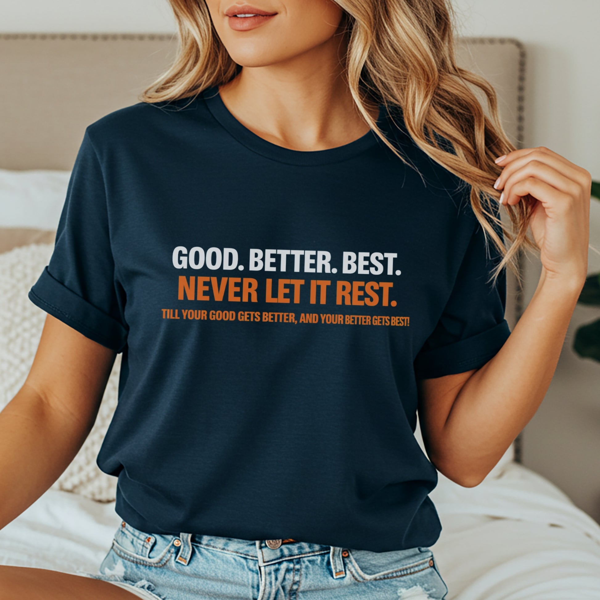 A rugged, garment-dyed cotton tee that carries a quiet message of steady ambition: “Good. Better. Best. Never let it rest.” The heavyweight fabric and relaxed fit sit comfortably through long days on the job or weekend projects. The soft, lived-in color from post-construction dyeing gives each shirt subtle depth and a worn-in feel that pairs naturally with work boots, jeans, or a hoodie. Clean, bold lettering across the chest reads like a personal mantra—motivating without shouting—and the durable double-needle stitching and tubular knit ensure this tee stays strong wash after wash. Sized from S to 4XL with many color choices, it’s built to be reached for whenever focus and quiet persistence are required.